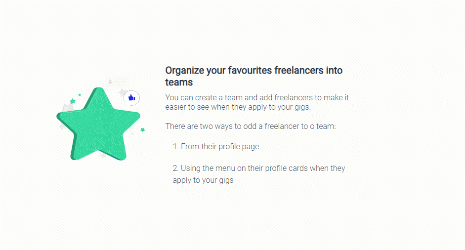 The Teams feature is designed to simplify your gig publishing process by allowing you to create private gigs for specific teams of freelancers.