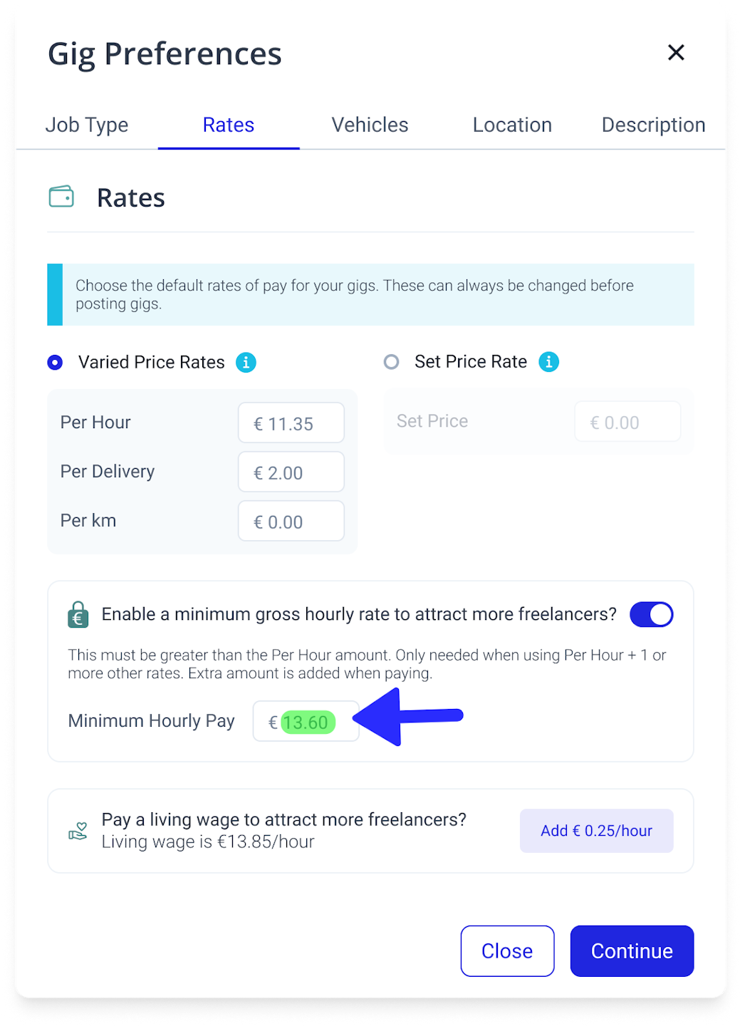 To activate this feature go to the Rates section in your gig preferences, and enter the minimum hourly wage in the highlighted cell (see figure).